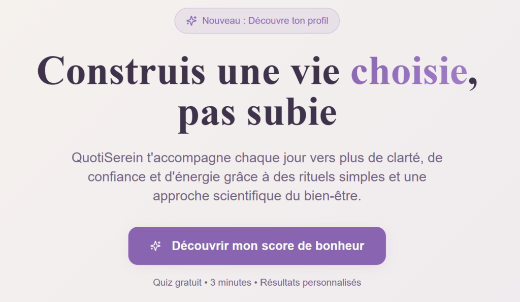 Des rituels QuotiSerein simples et efficaces pour commencer à transformer ta vie. C’est exactement ce que tu cherchais pour reprendre ta vie en main et ne plus subir te quotidien. Si tu veux te retrouver, lis cet Ebook et mets le challenge en place.