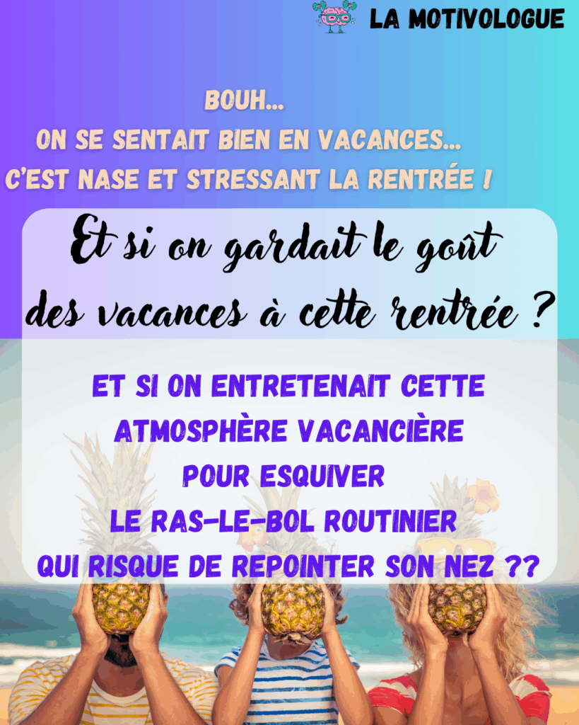 plutôt que de la passer à courir, à stresser… ? Et si tu faisais le challenge de rentrée, offert par la Motivologue ? Prends ta vie en main glisse de la sérénité et du peps dans ton quotidien. Goûte à la Motivologie et pars du bon pied en gardant l’état d’esprit des vacances et ainsi éviter de tomber dans le stress !