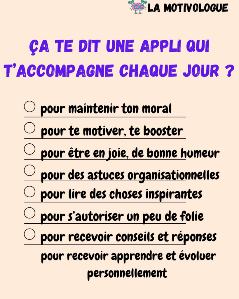 Une appli pour t’accompagner quotidiennement, te motiver, te booster, te mettre de bonne humeur, des donner des tips, des défis, … c’est un truc qui me dit carrément !